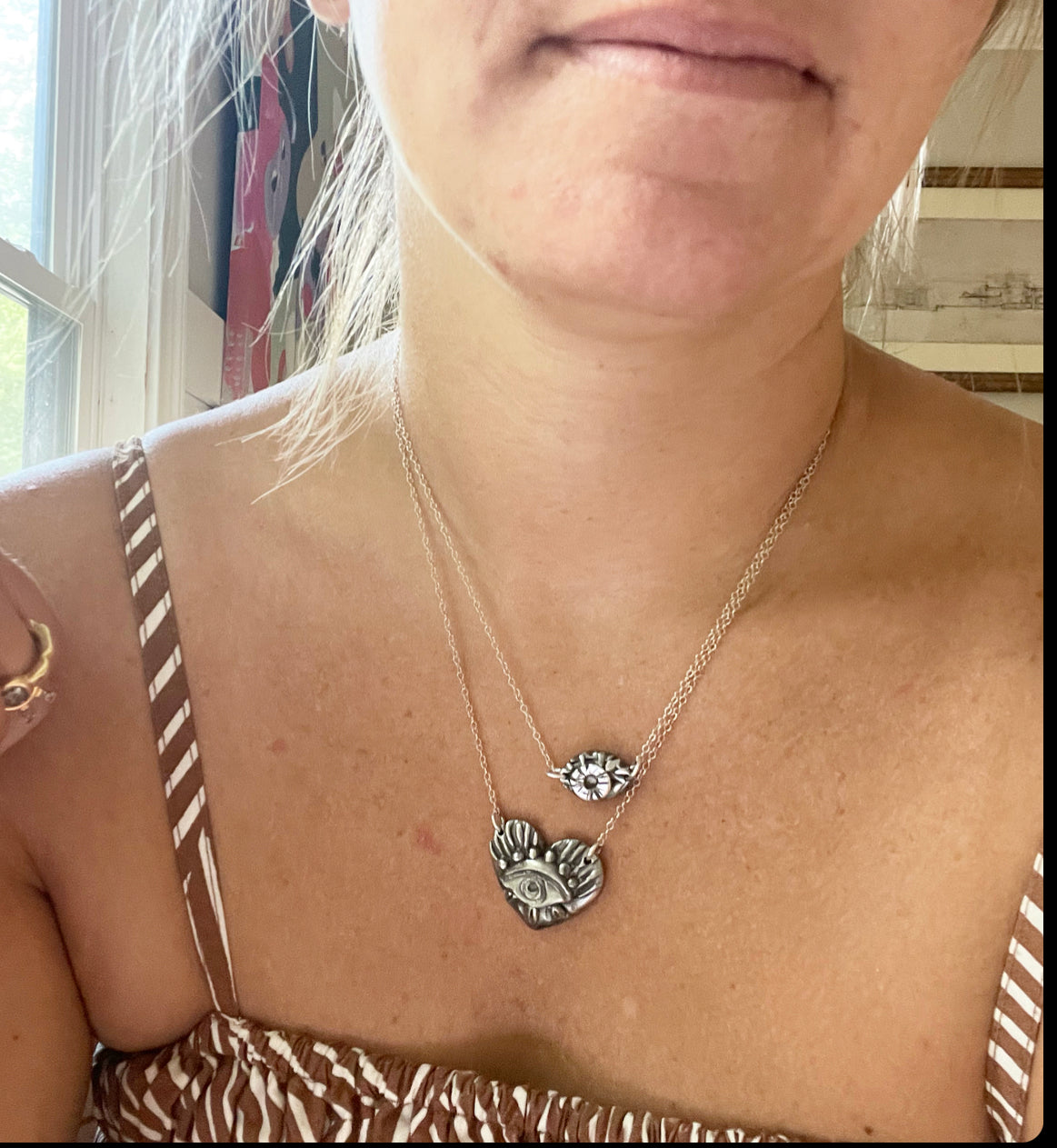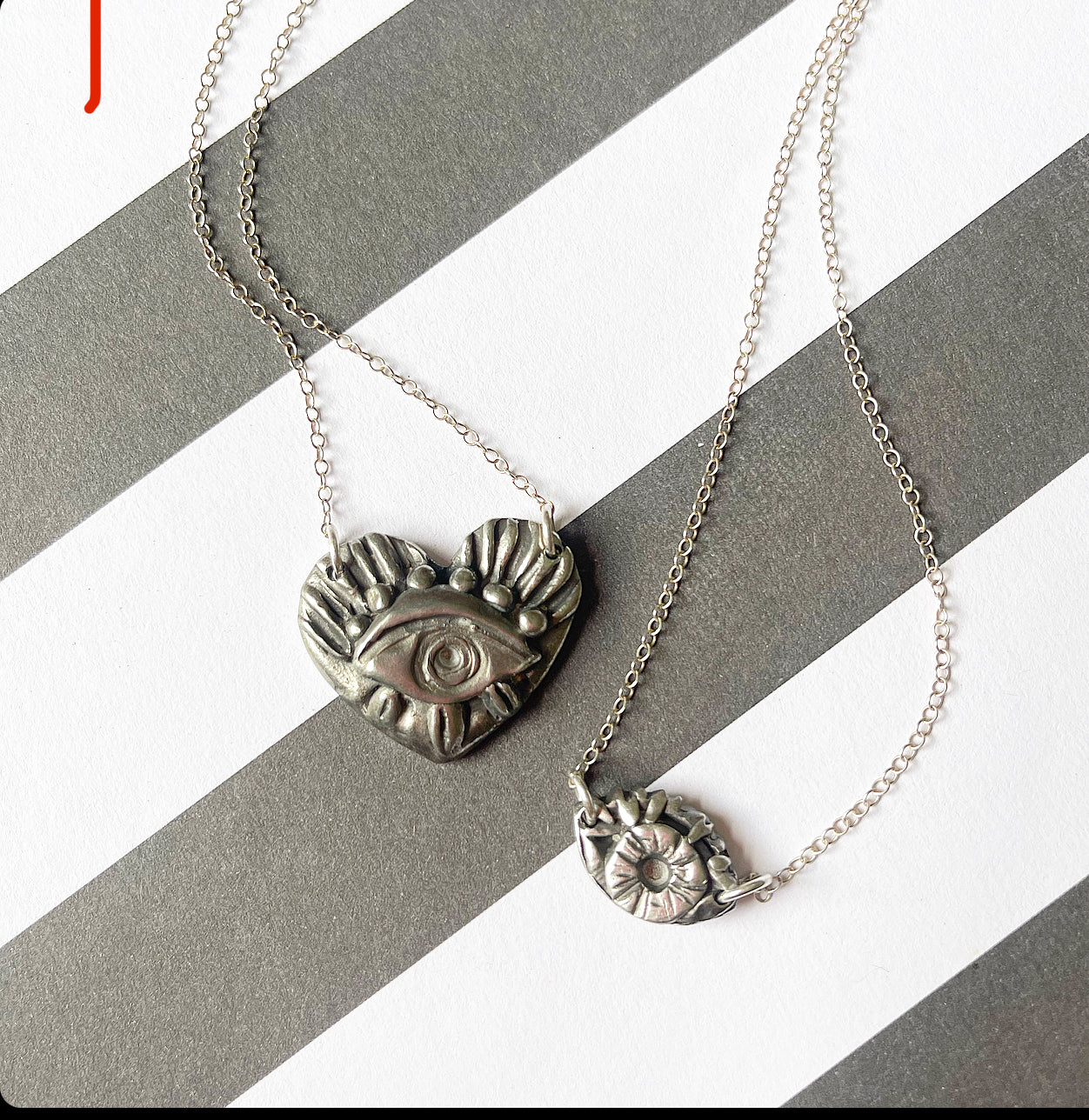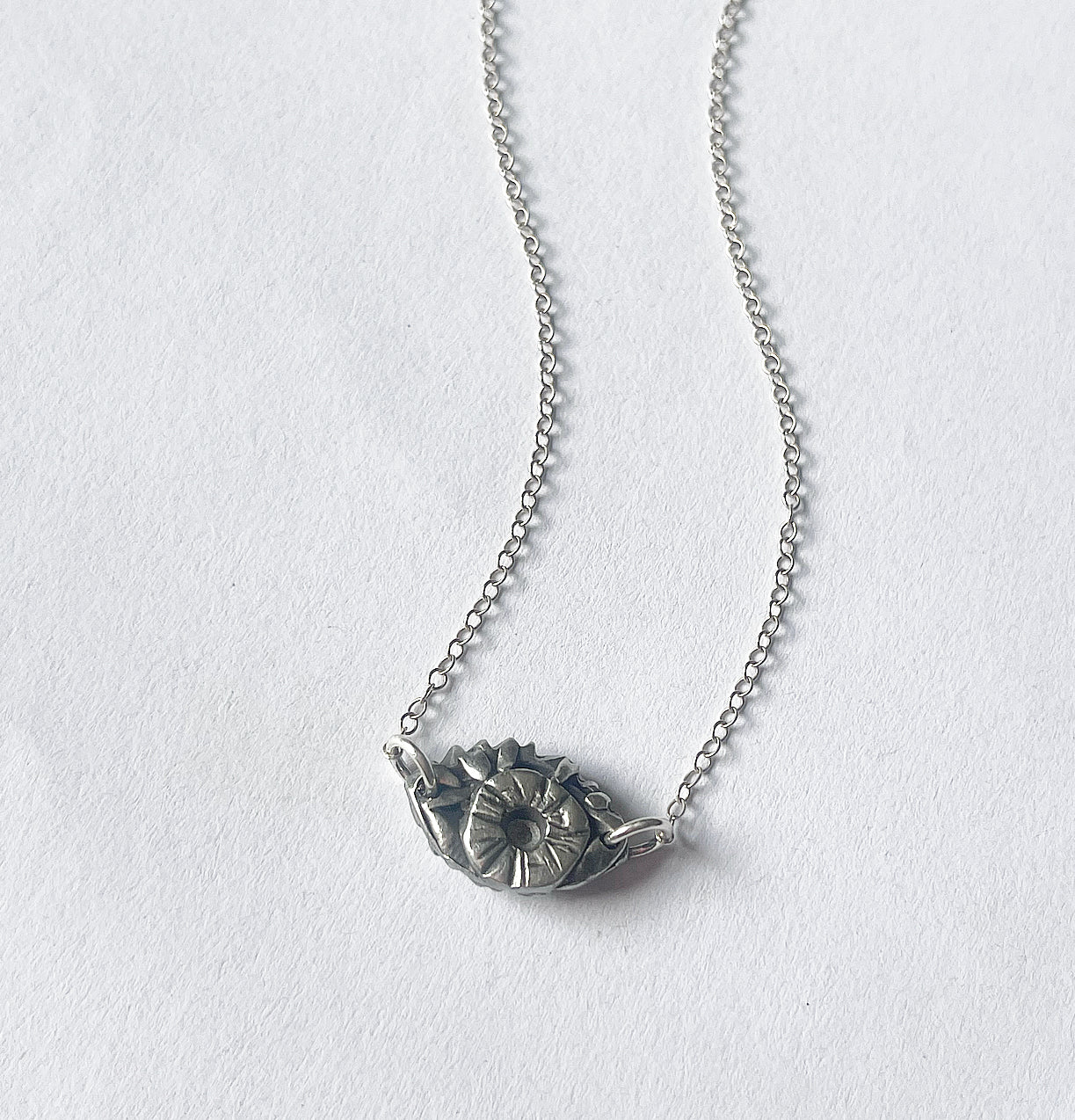 Protect yourself with this small double sided evil eye. Hand sculpted, cast pewter, silver chain and findings. 16-17in