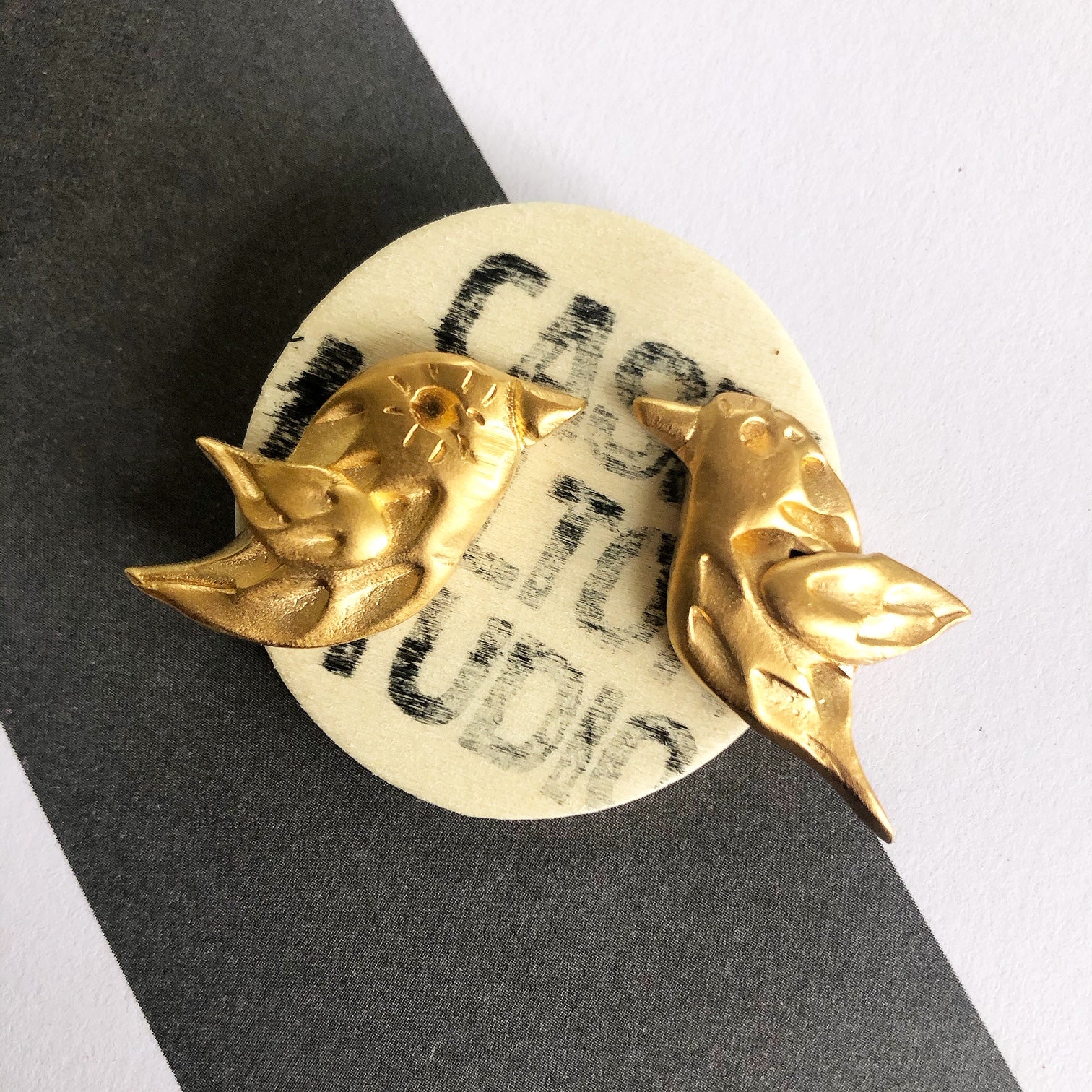 These bird earrings are sculpted by me. I made each one a little different, perfectly imperfect. They definitely make a unique statement. Gold plate, silver post and backs.