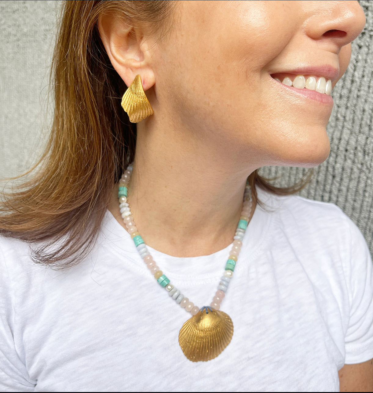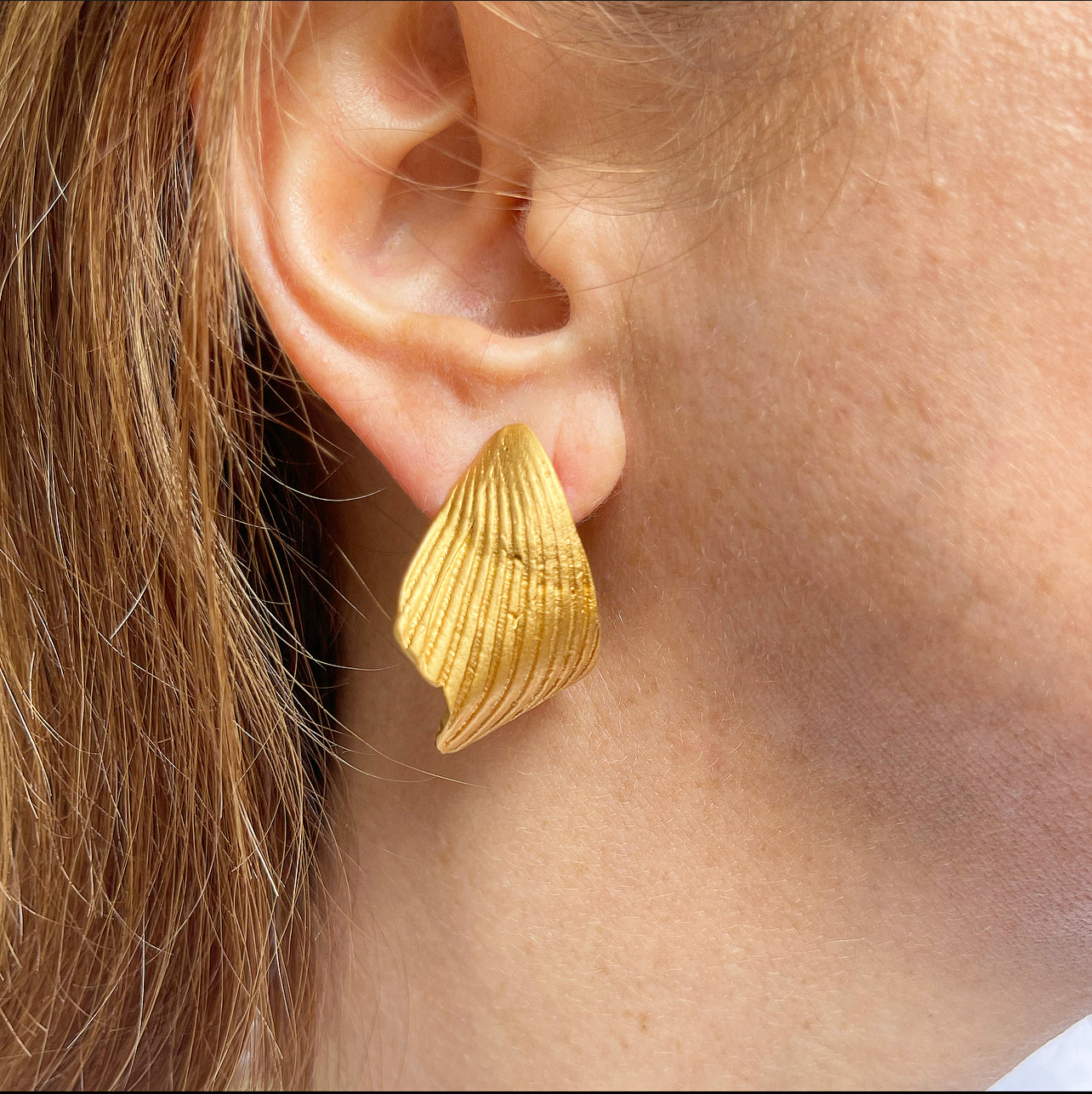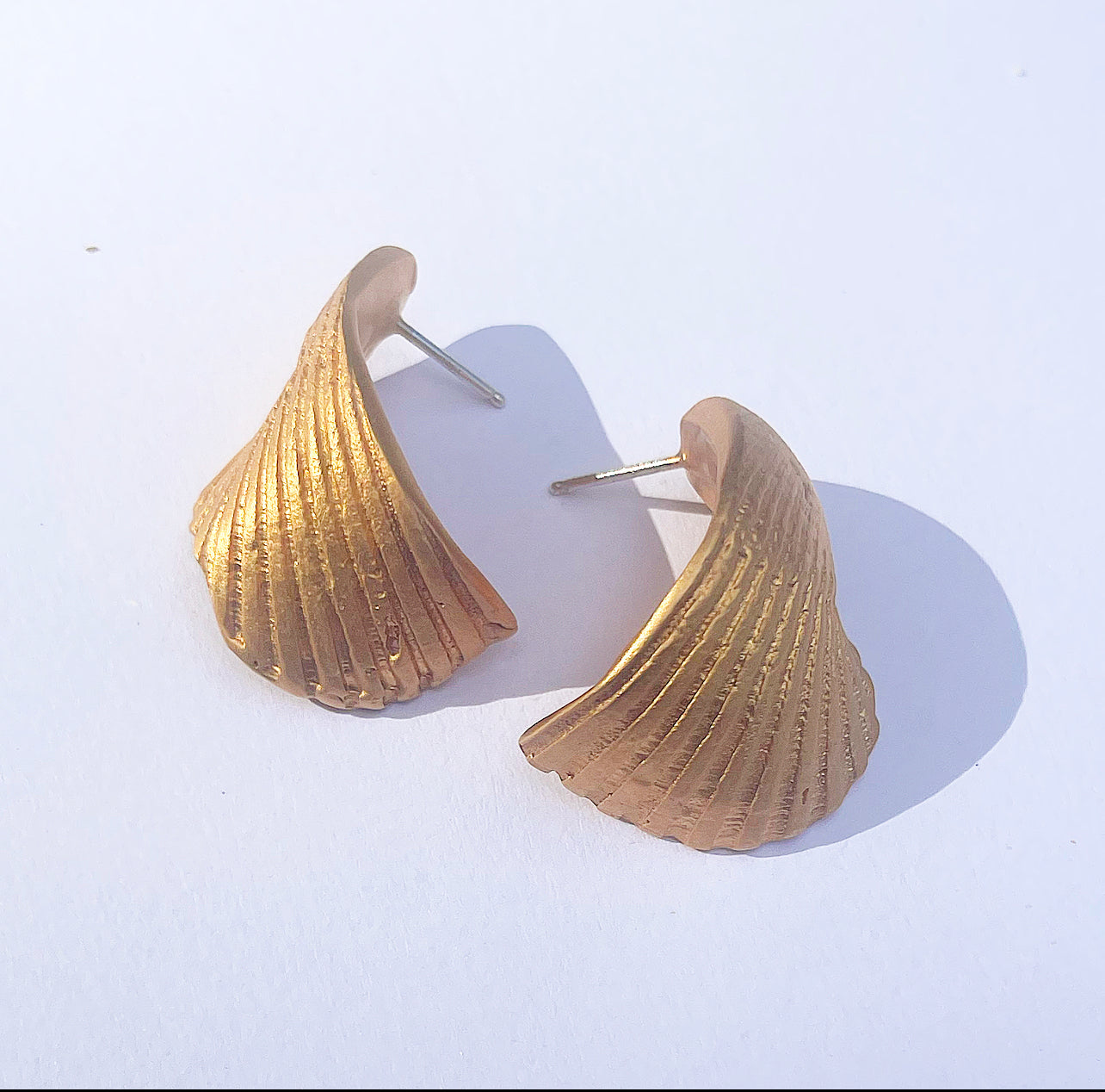 Cracked pieces of shell wash to shore over time and we are left to find these beautiful and funky shapes and sizes. A nod to the original vessel, now an organic and refined art piece that looks like it was made to complement the ear and the face. As always cast in pewter and plated in 24k gold with sterling silver posts and backs.