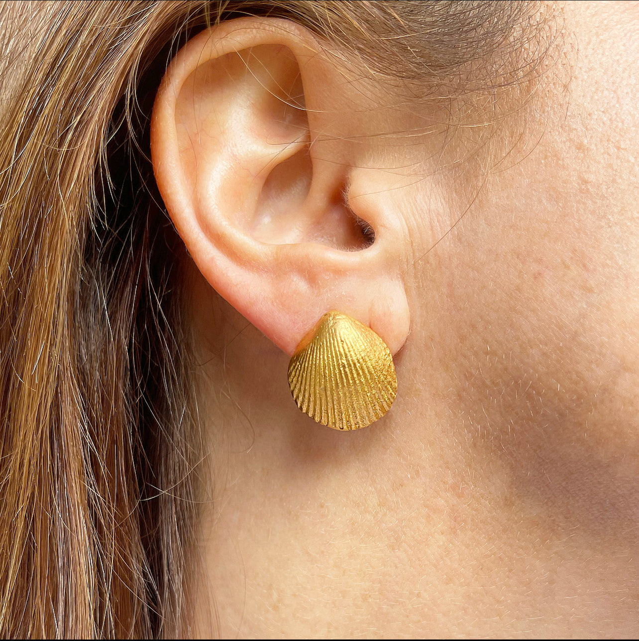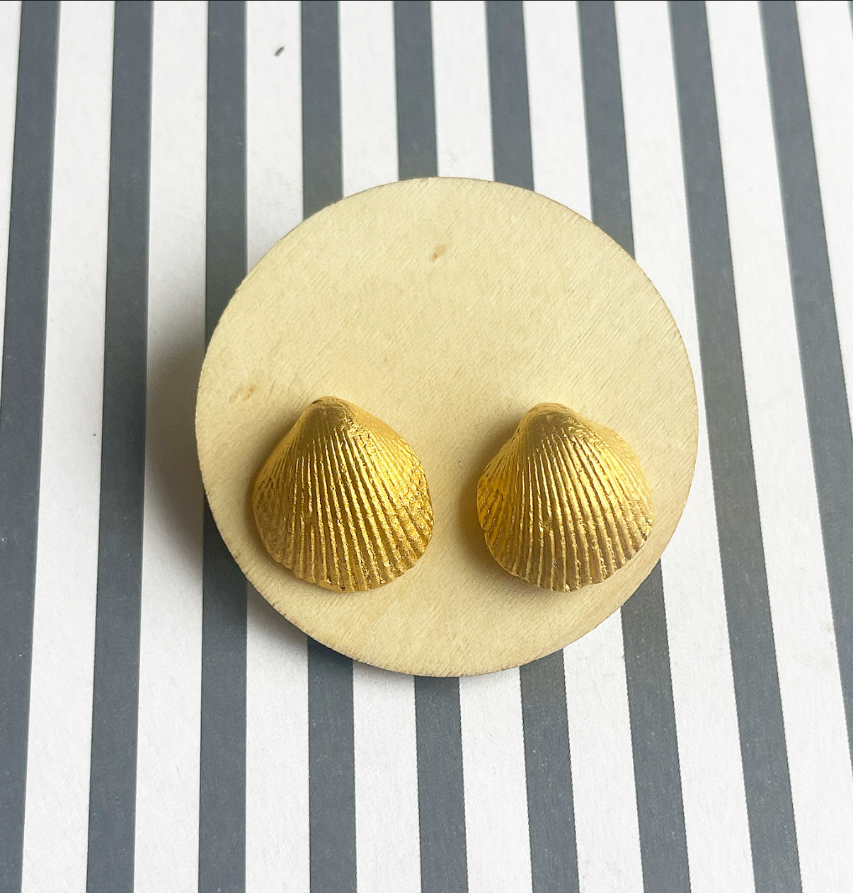 These gold shell earrings are cast from an actual shell I found walking one of my favorite beaches. They will become your everyday-no brainer-goes with everything earring. Handmade, cast in pewter and plated in 24k gold with sterling silver posts and backs.