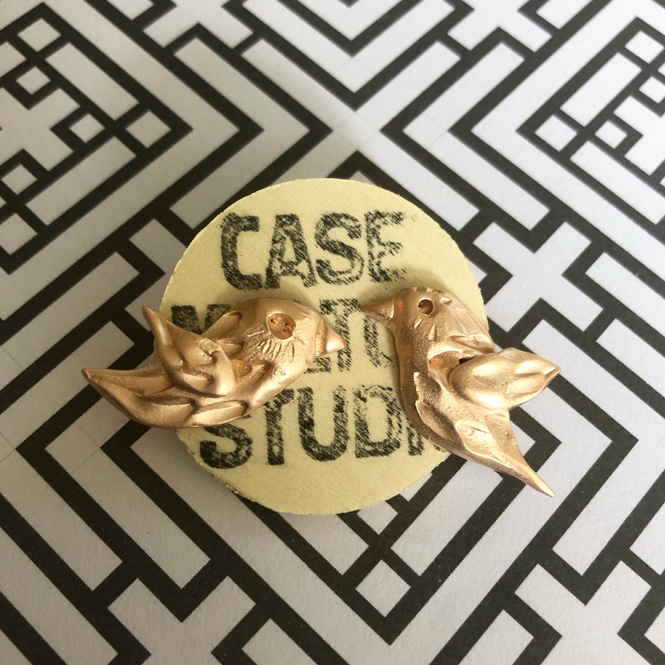 These bird earrings are sculpted by me. I made each one a little different, perfectly imperfect. They definitely make a unique statement. Rose gold plate, silver post and backs.