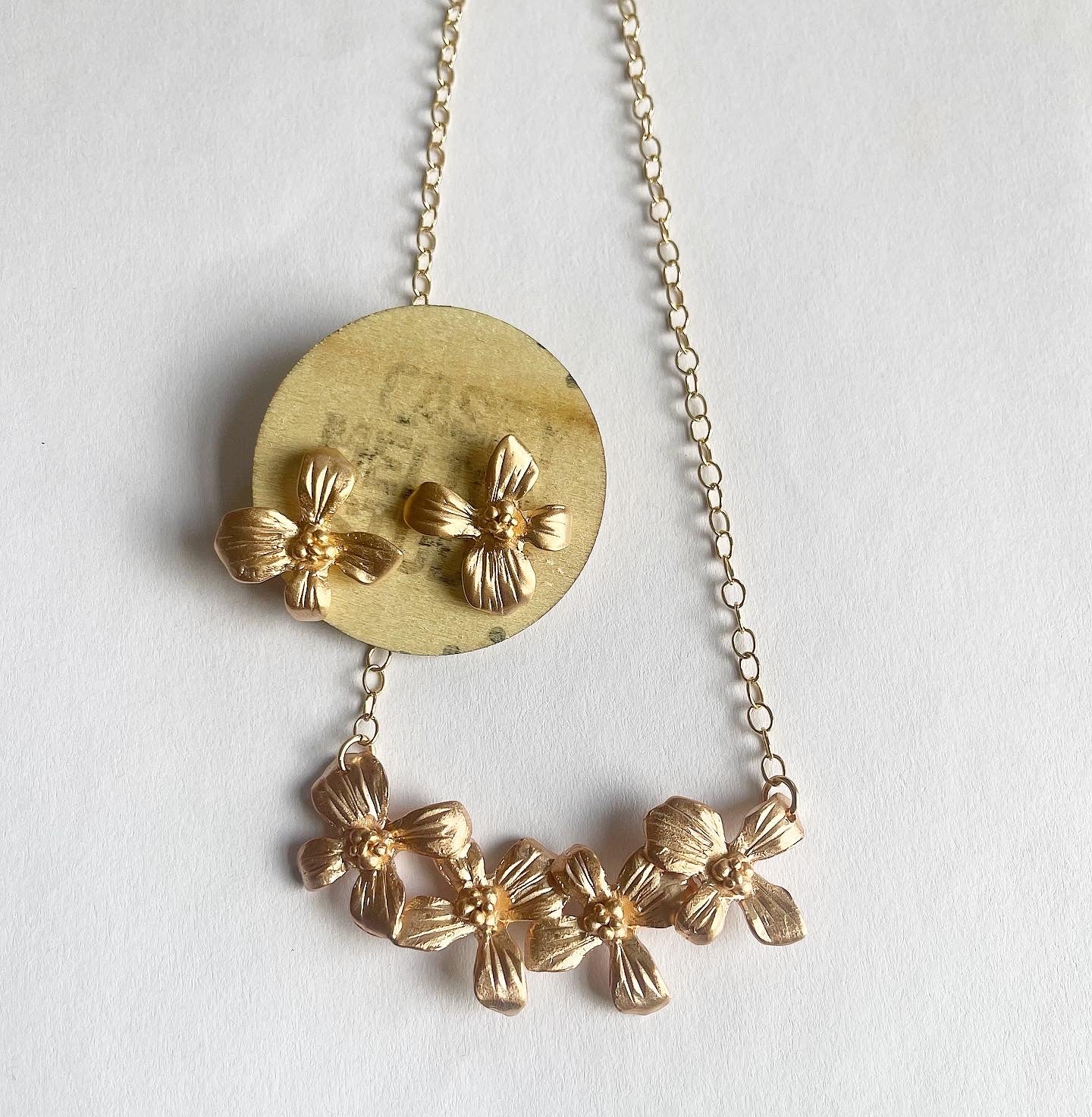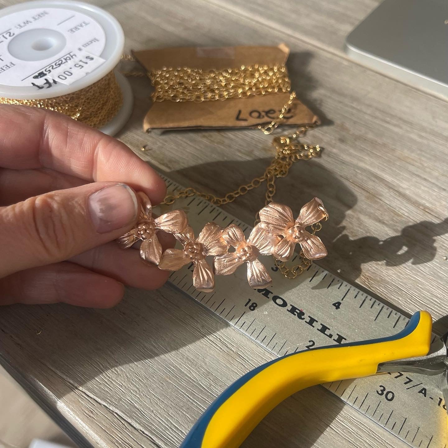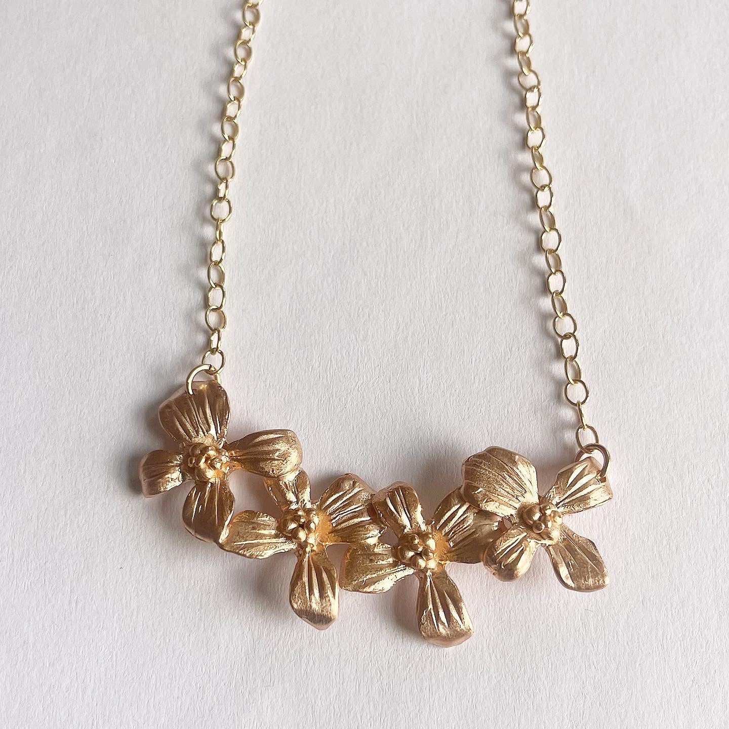 Cast pewter, rose gold plated, hand-sculpted dog wood blooms on gold fill chain 16-18in . Make a bold statement with this stunner.