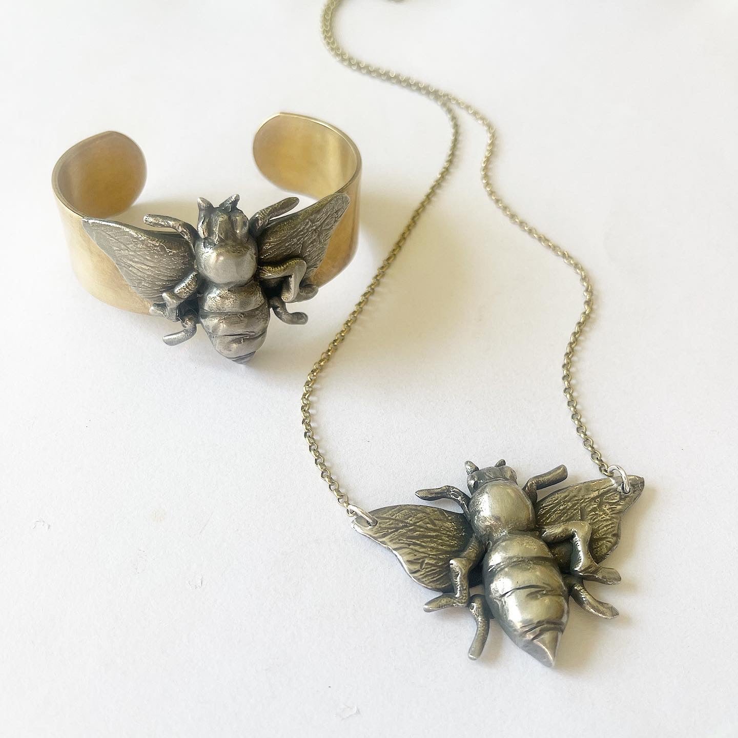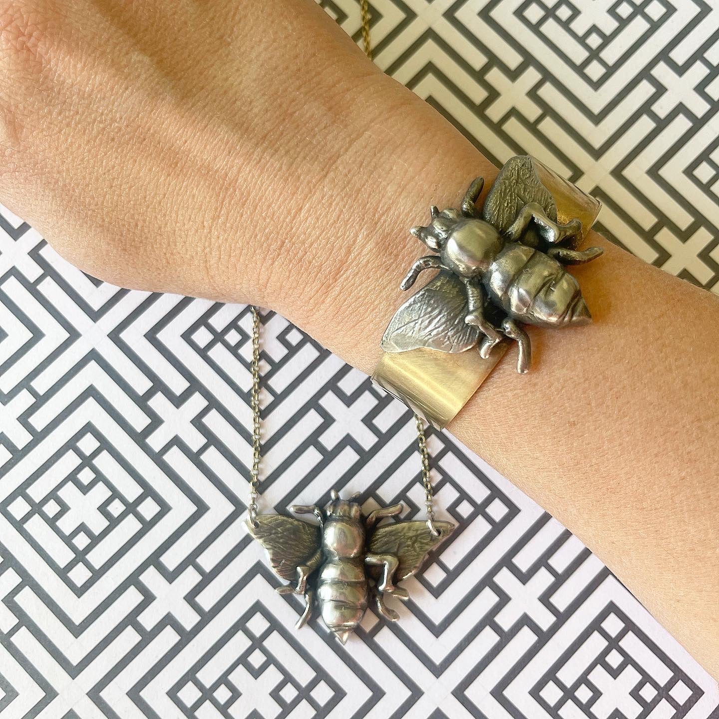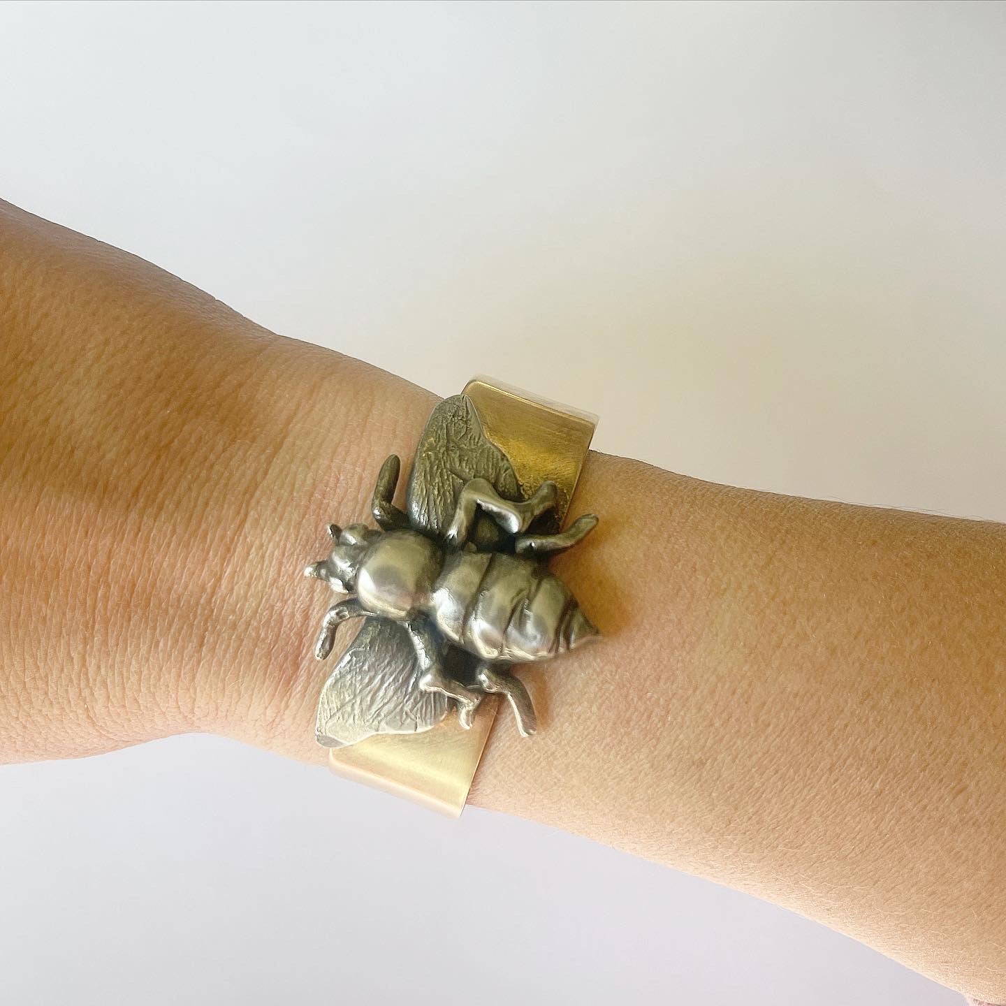 This handmade bee cuff is sure to make a statement.   The bee is cast in pewter and soldered to a solid brass cuff.