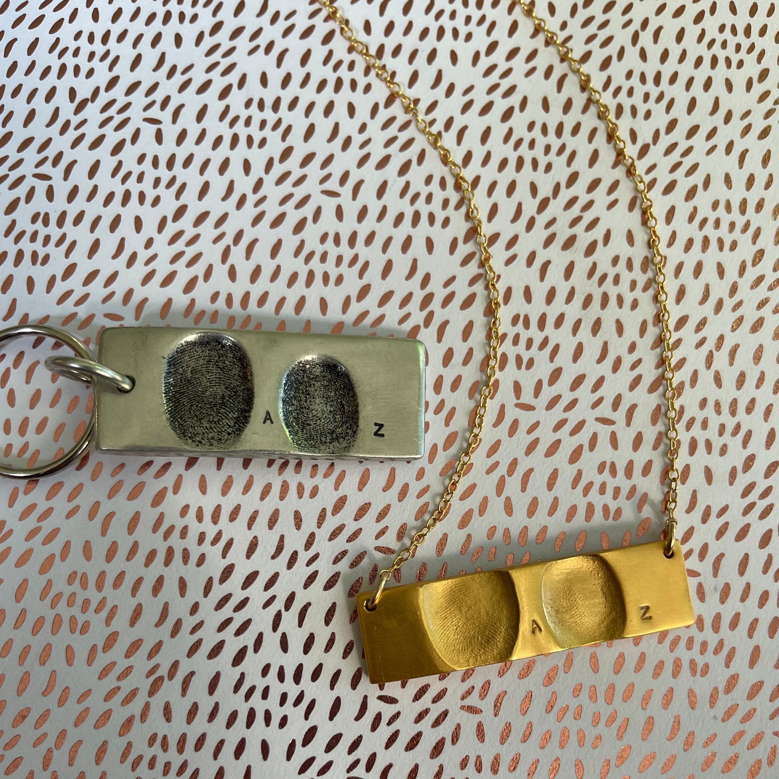 Prints of love are cast pewter keepsakes adorned with fingerprint impressions capturing a moment in time and lasting forever. The keepsakes range from $60-$195. All products are cast pewter with the option to 24k gold plate or rose gold plate. Products include necklaces, keychains, cufflinks, earrings, ornaments and paperweights. The fingerprints can be done at any age but the handprints are babies only (8 months and younger).