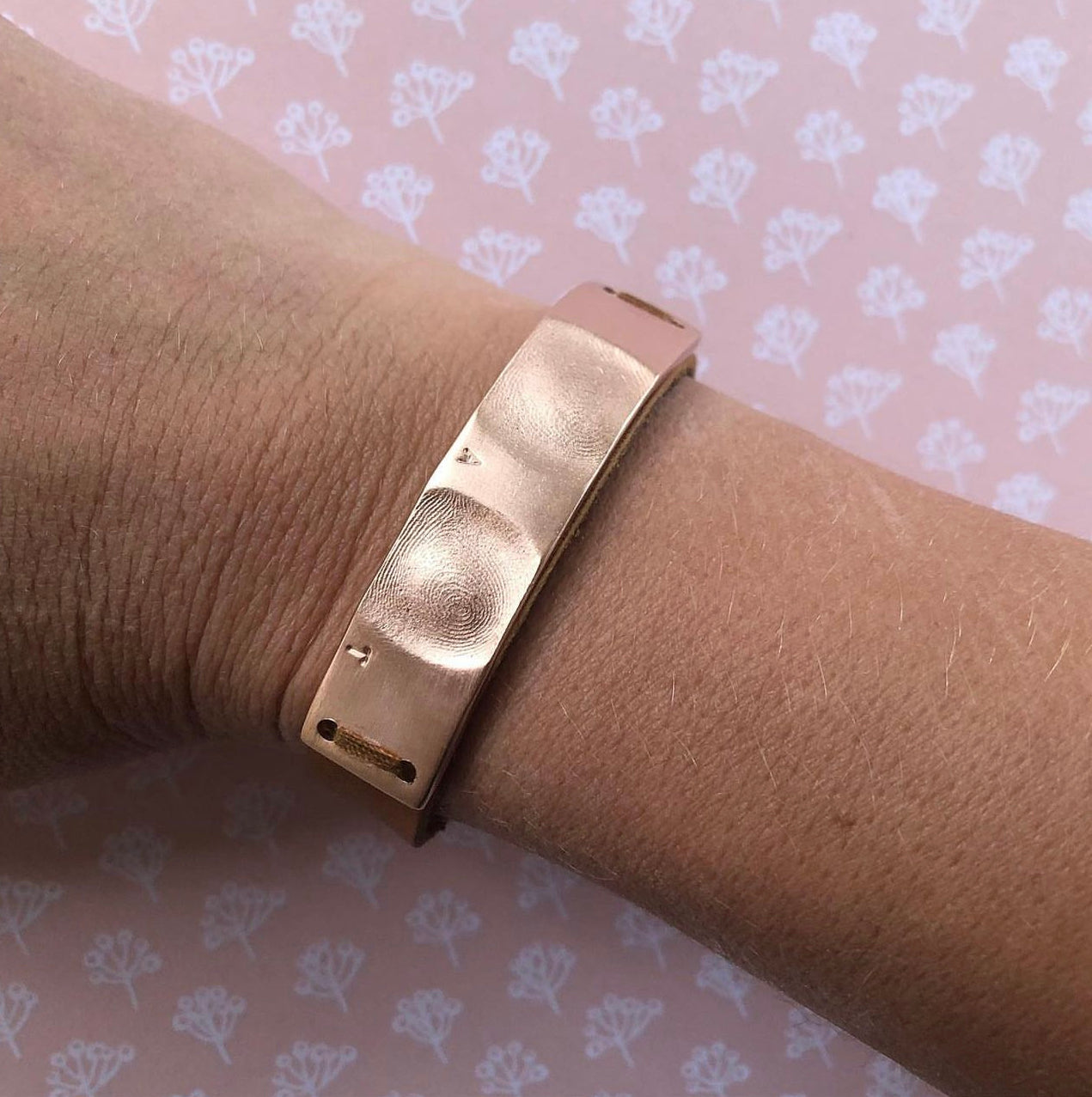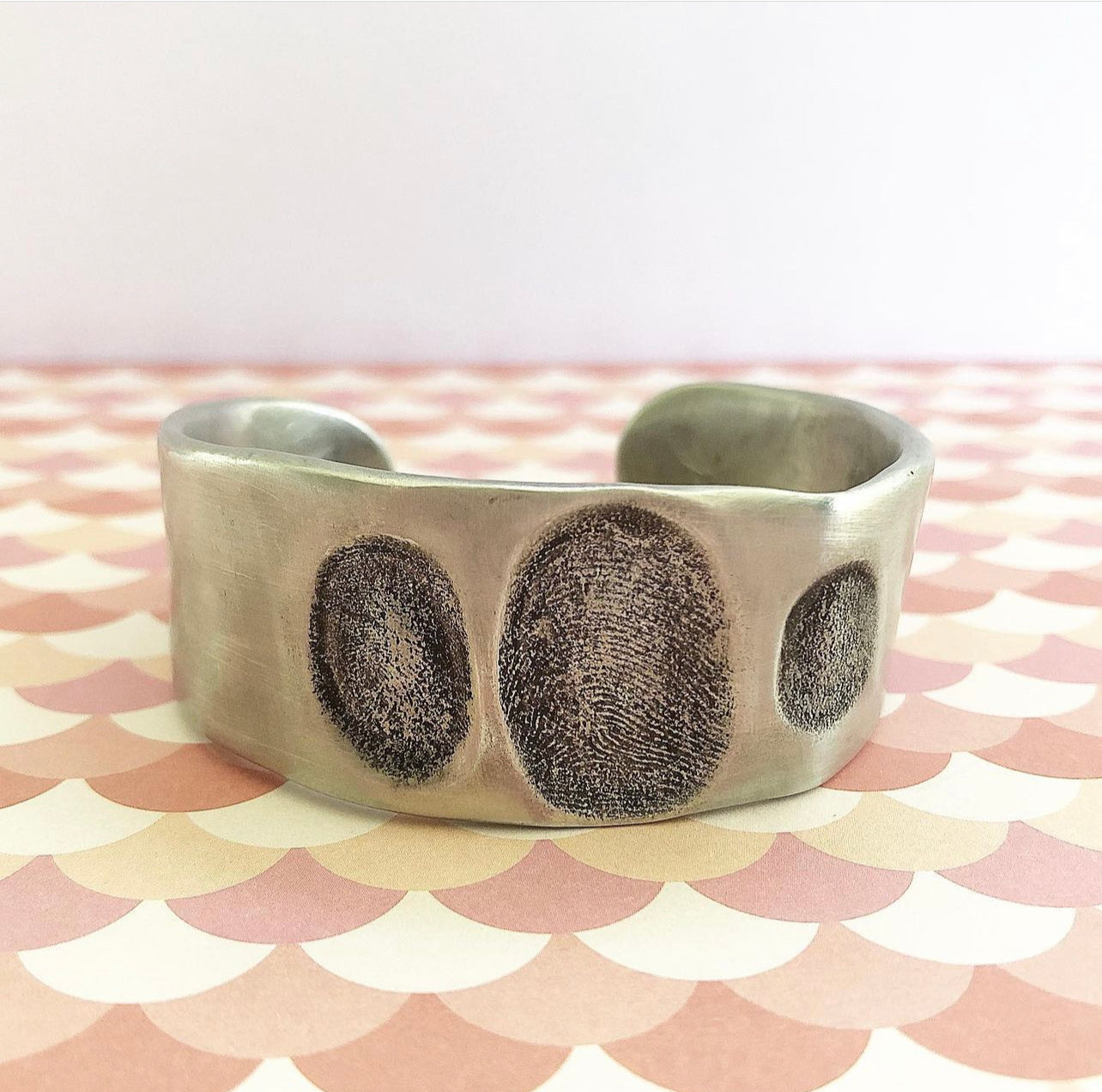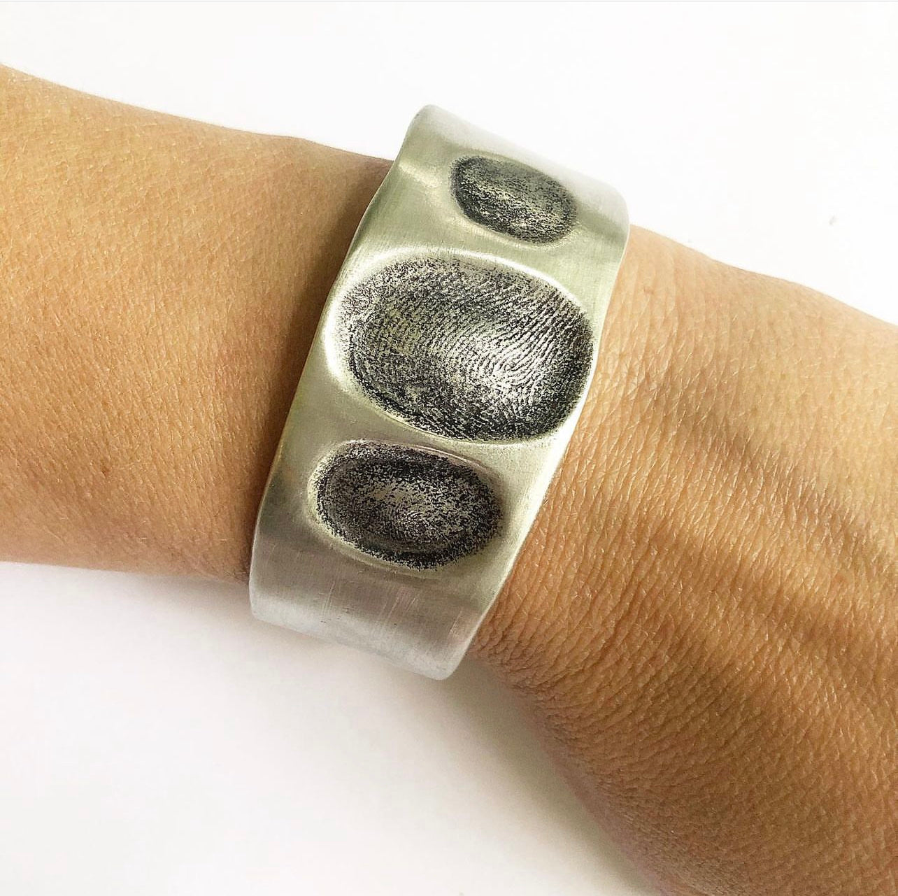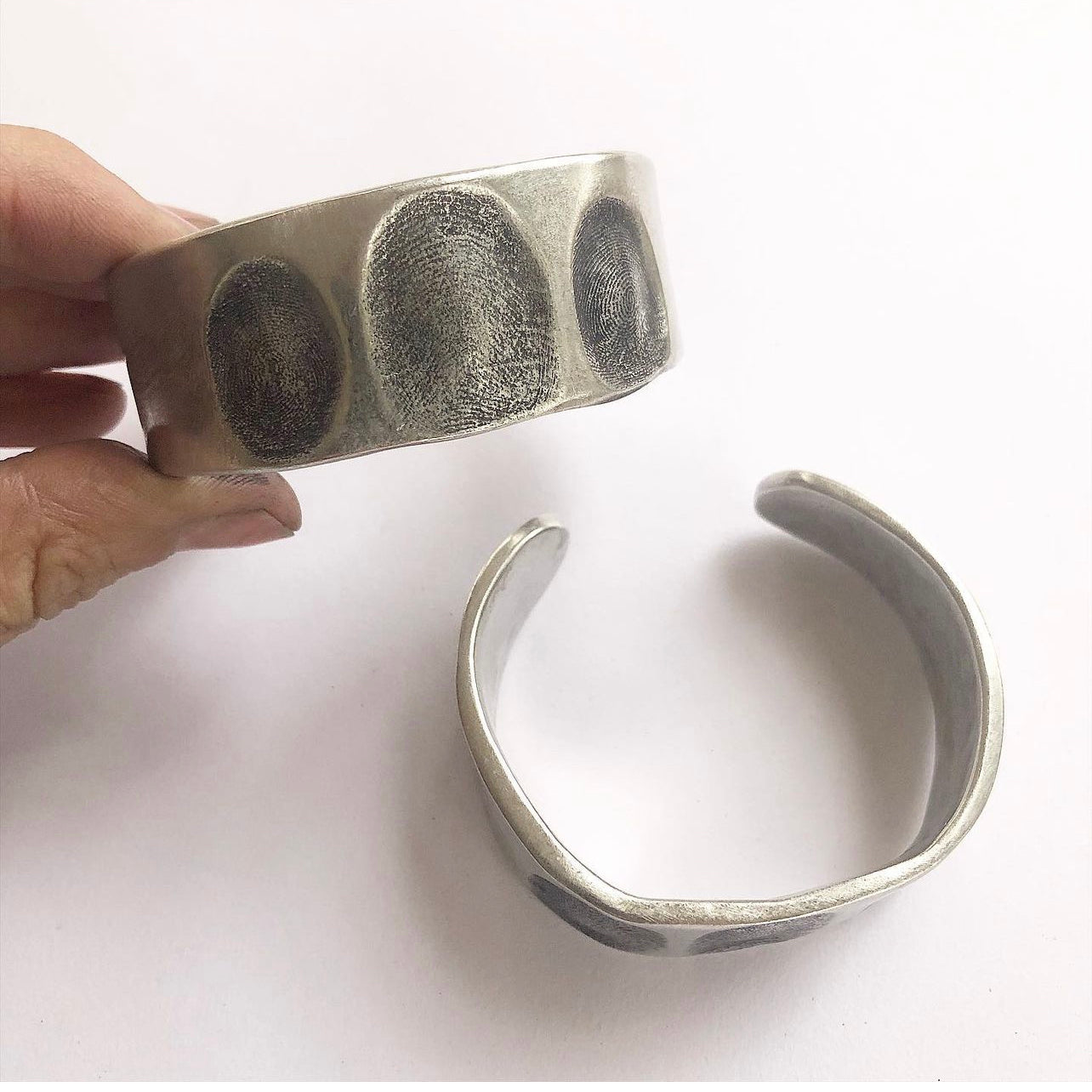 A fingerprint bracelet is adorned with prints of those you hold closest to your heart. These keepsake are made from a direct clay impression and cast in pewter with the option to 24k gold plate or rose gold plate. Prints of love keepsakes are handmade and capture a moment in time.