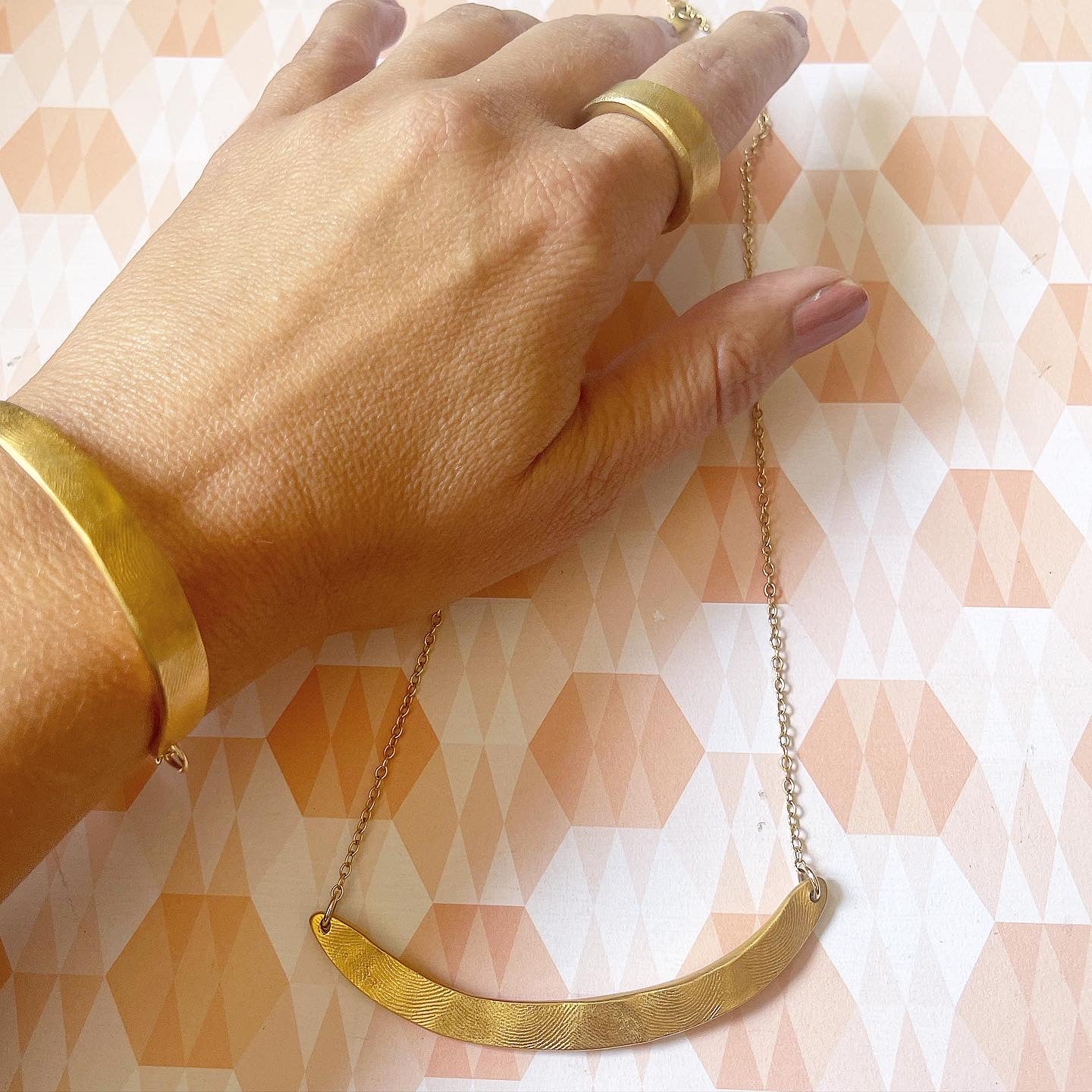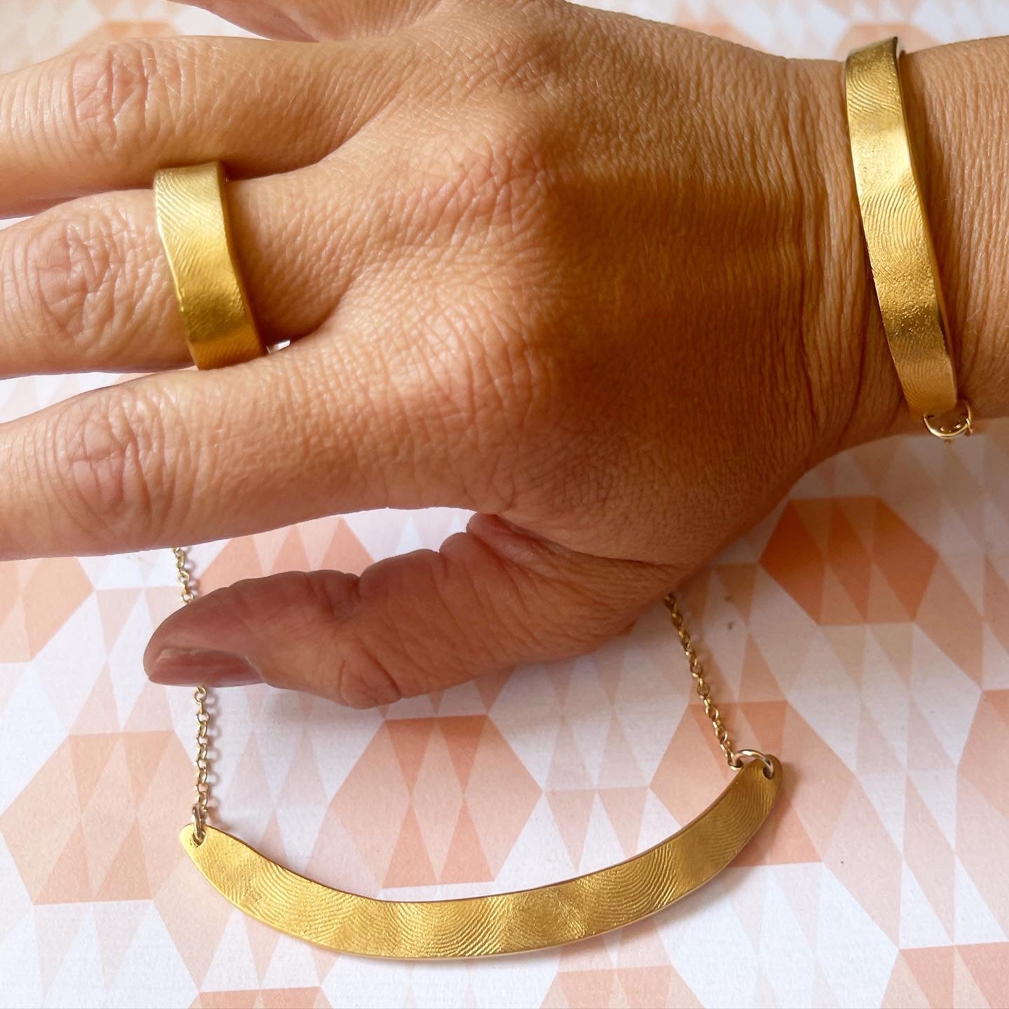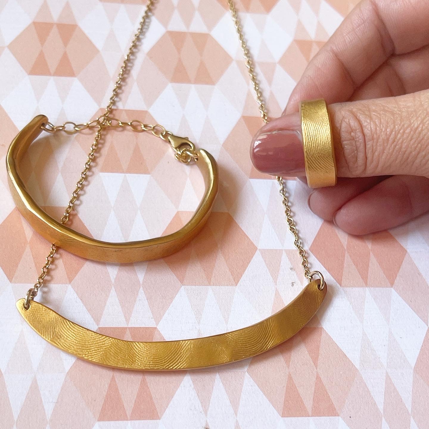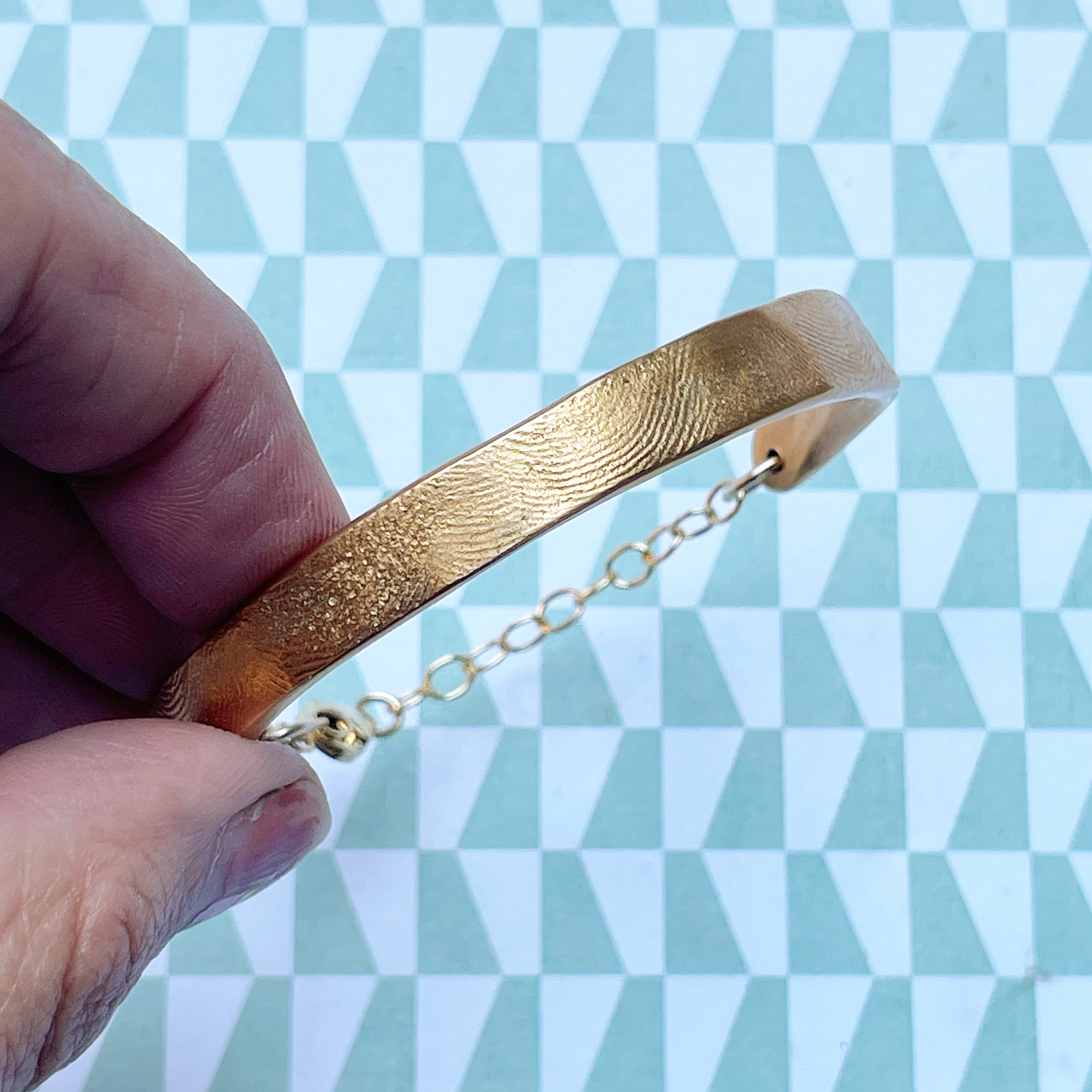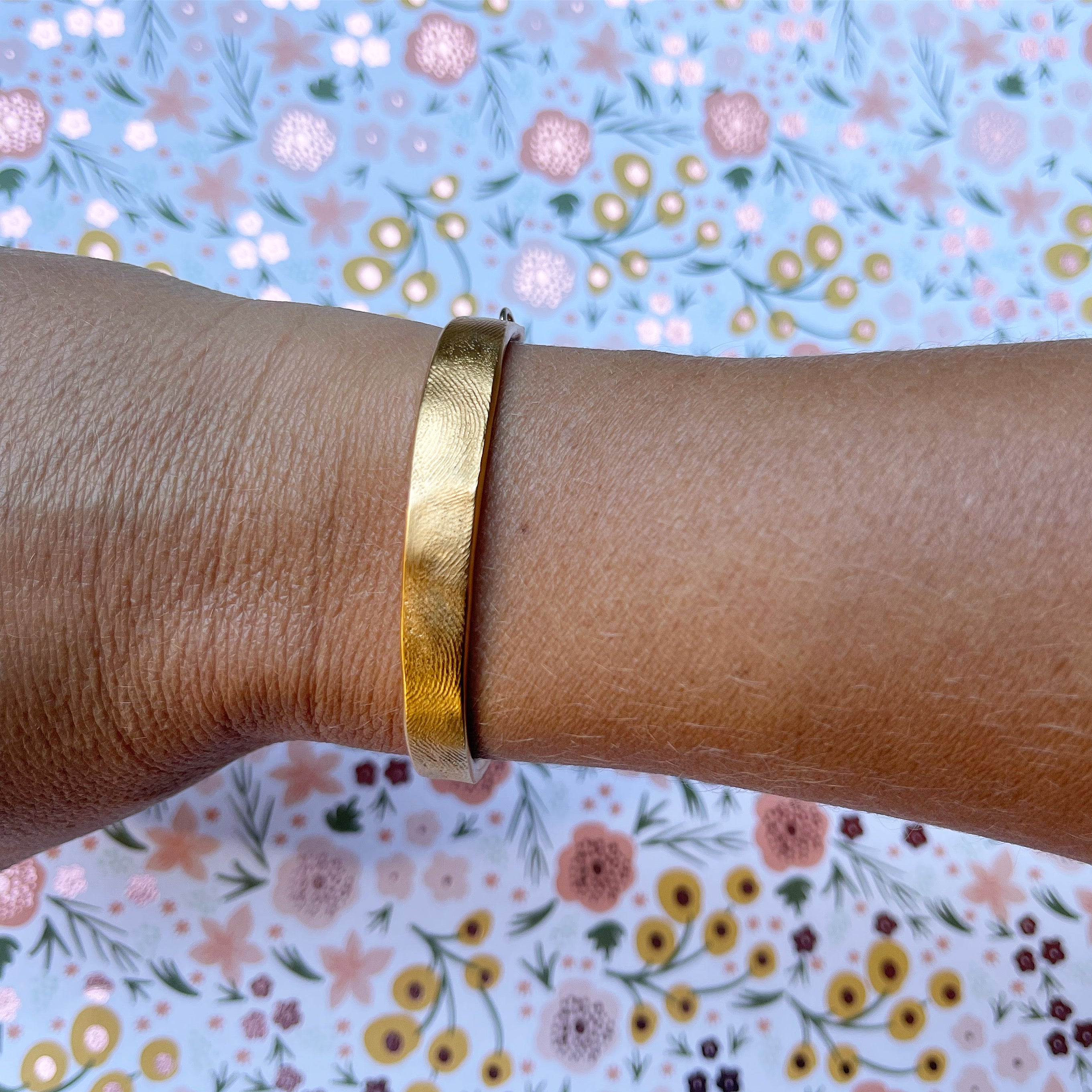 A fingerprint bracelet is adorned with prints of those you hold closest to your heart. These keepsake are made from a direct clay impression and cast in pewter with the option to 24k gold plate or rose gold plate. Prints of love keepsakes are handmade and capture a moment in time.