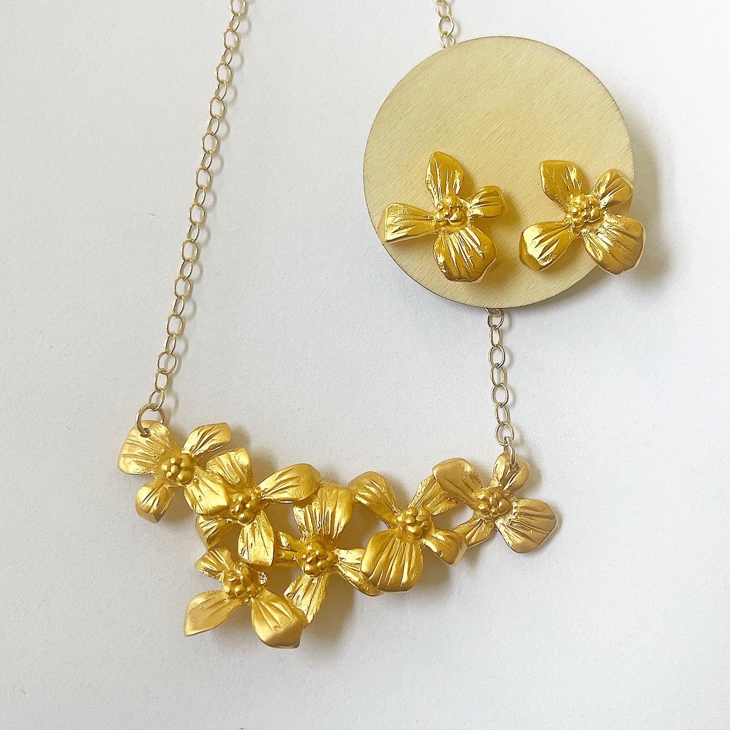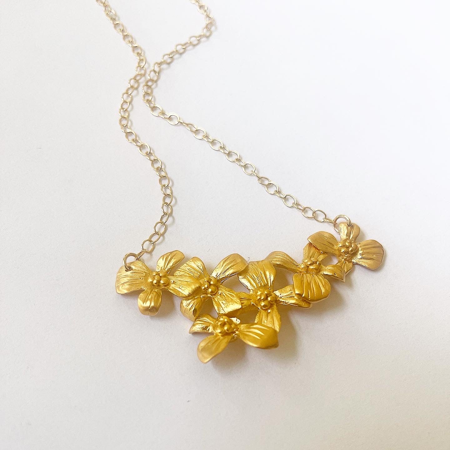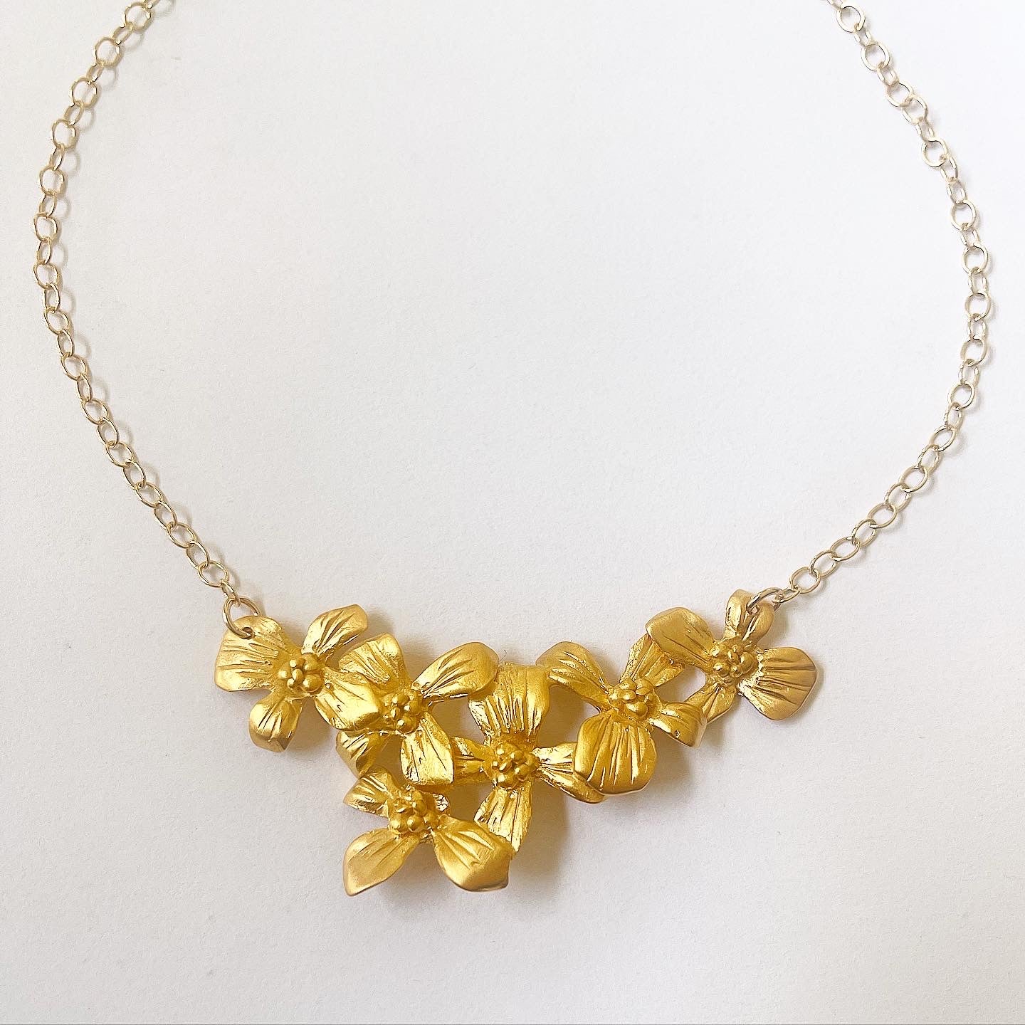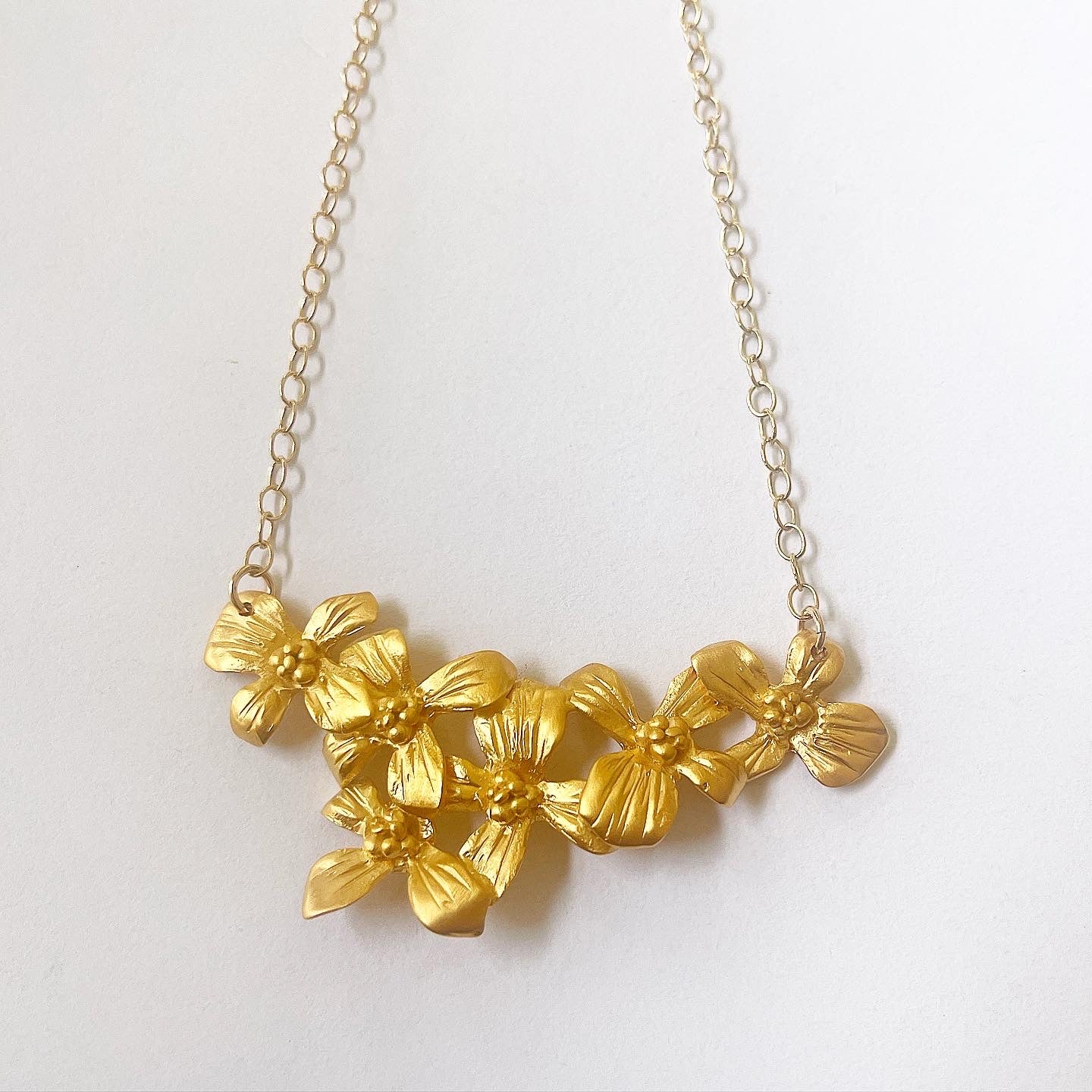 Each necklace has a unique combination of dogwood bloom clusters. You make a statement in this handmade stunner. 24k gold plated with gold fill chain and clasp. 16-18in