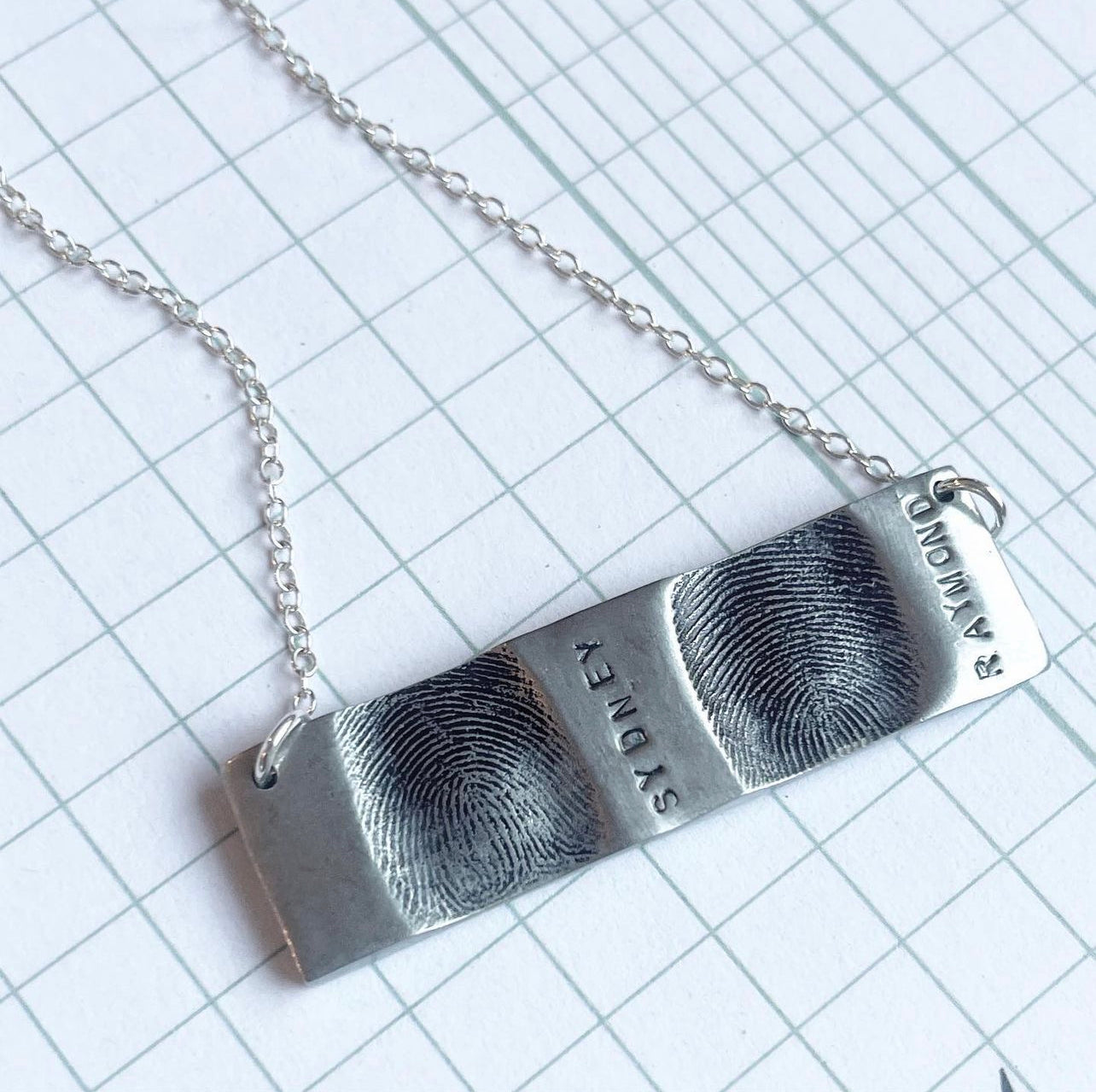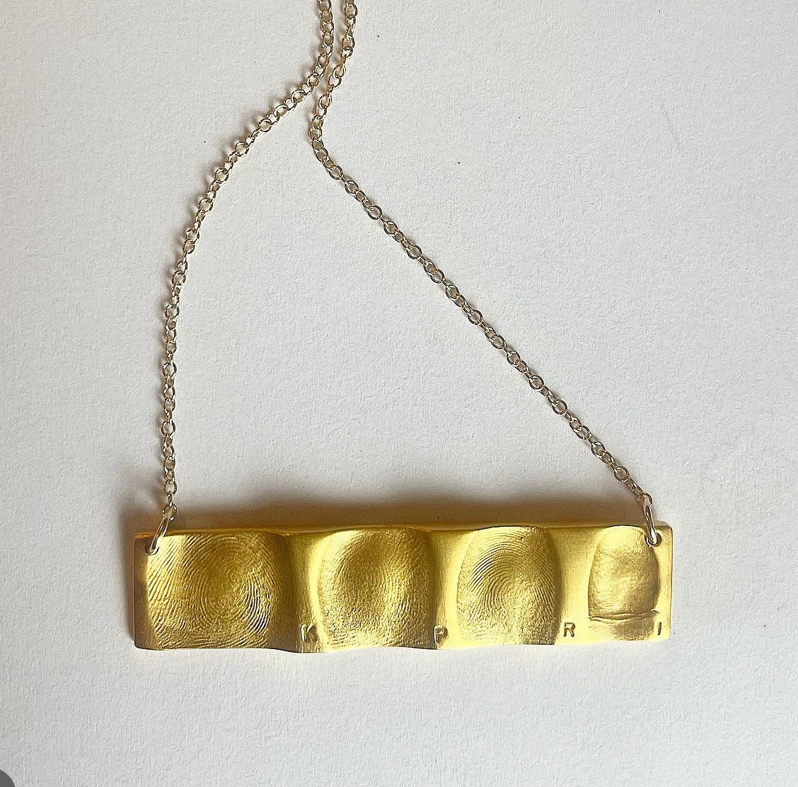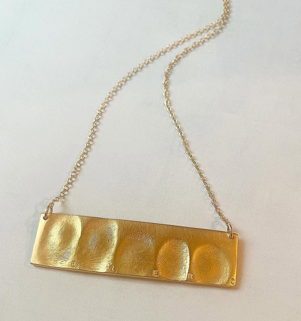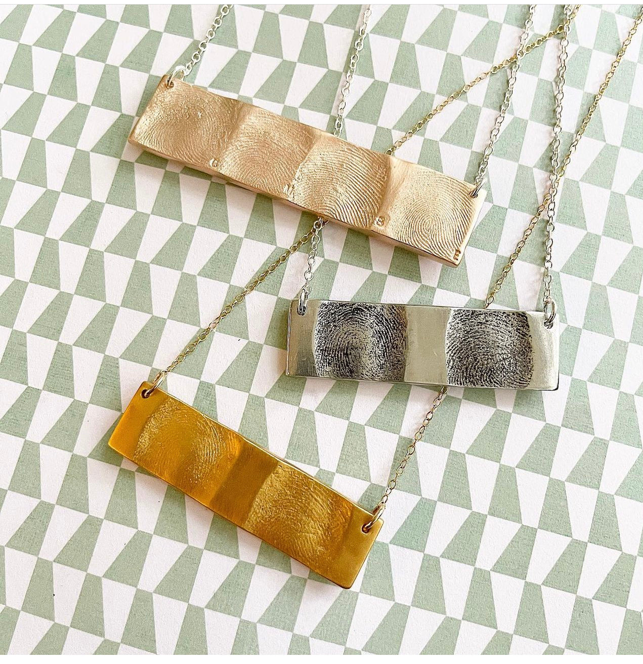 A fingerprint bar necklace adorned with prints of those you hold closest to your heart. These keepsake are made from a direct clay impression and cast in pewter with the option to 24k gold plate or rose gold plate. Prints of love keepsakes are handmade and capture a moment in time.
