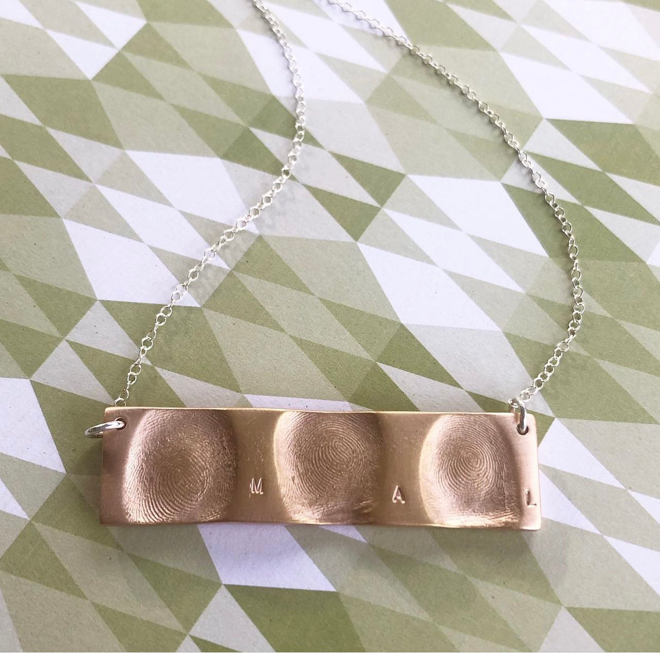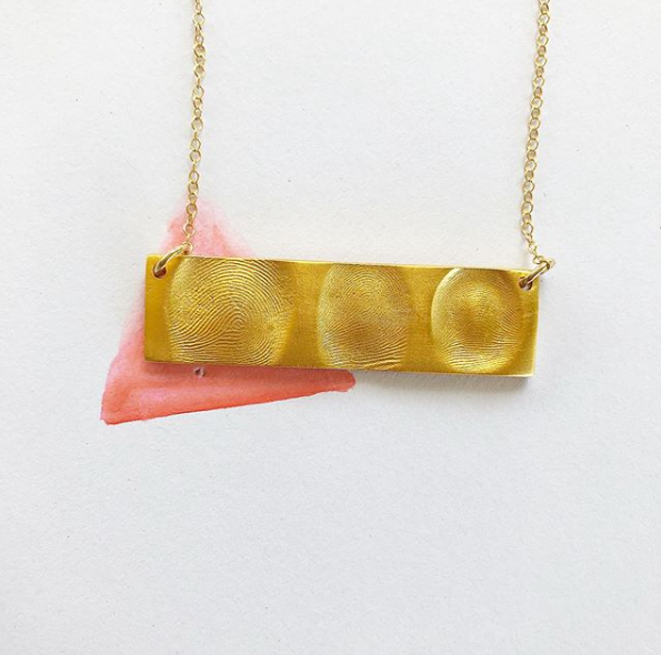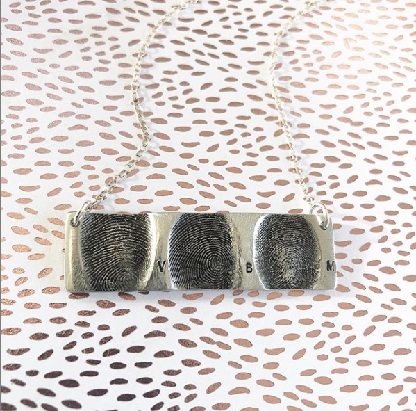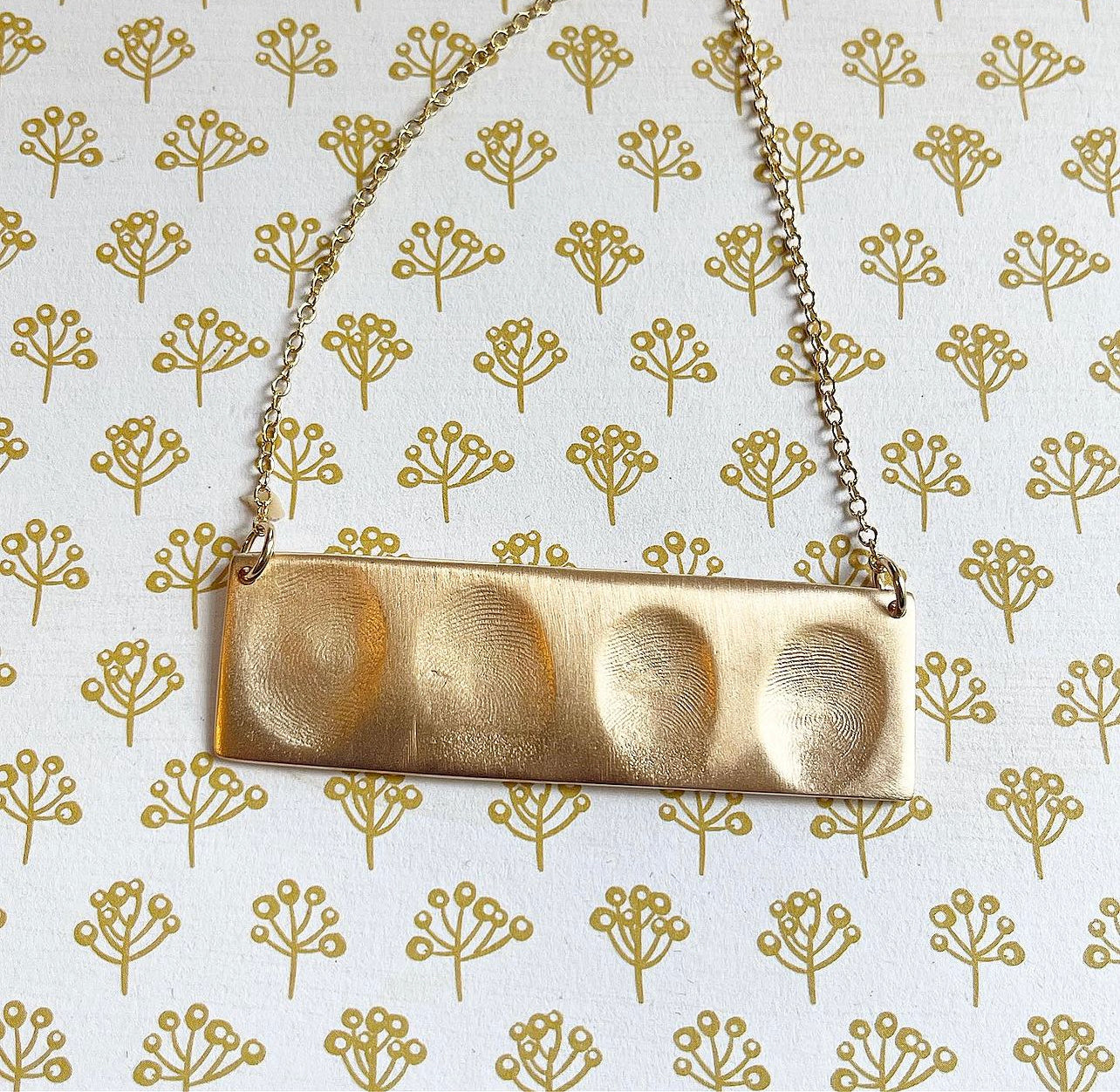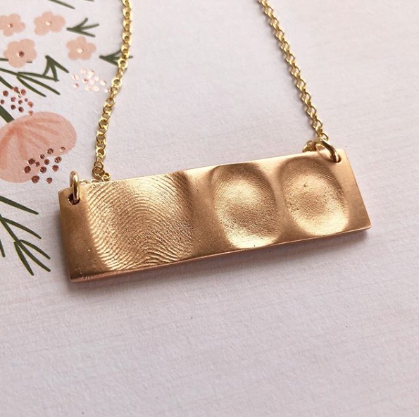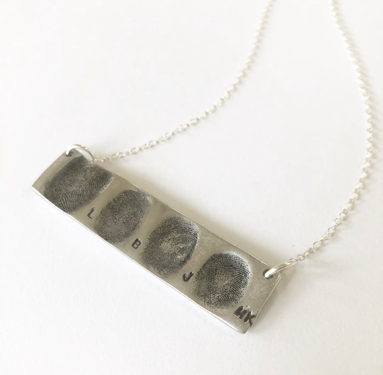 A fingerprint bar necklace adorned with prints of those you hold closest to your heart. These keepsake are made from a direct clay impression and cast in pewter with the option to 24k gold plate or rose gold plate. Prints of love keepsakes are handmade and capture a moment in time.