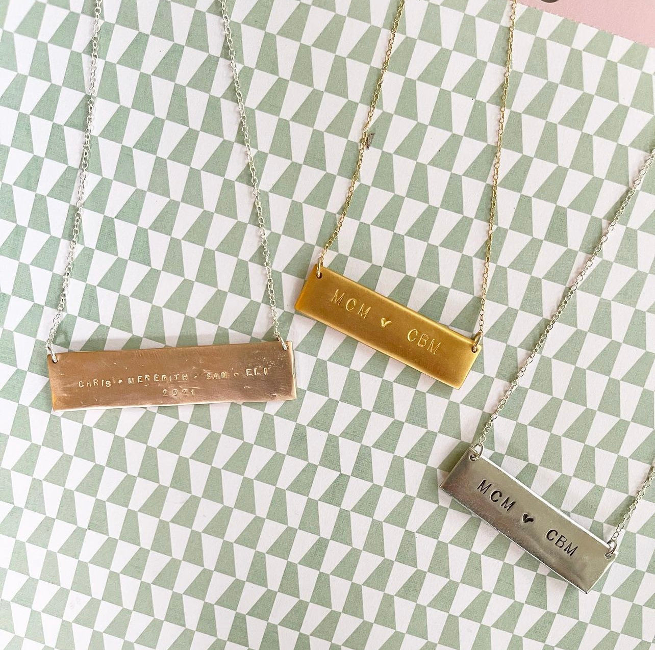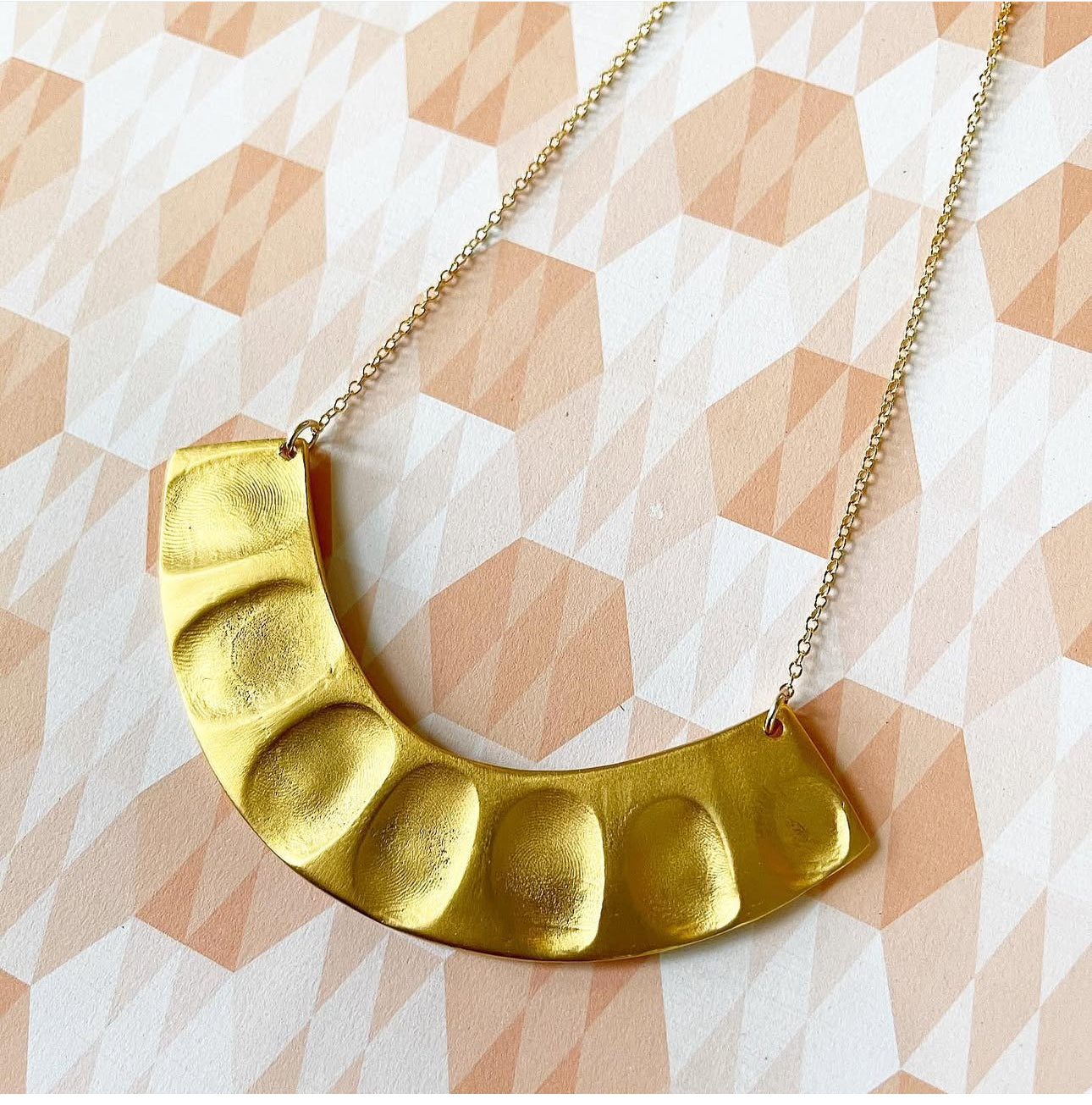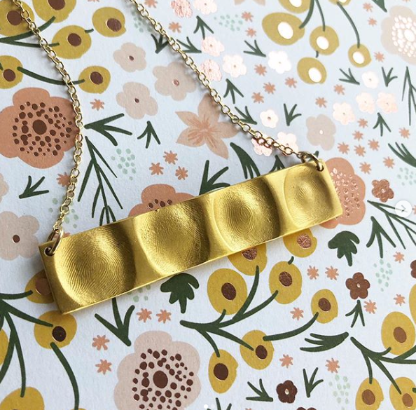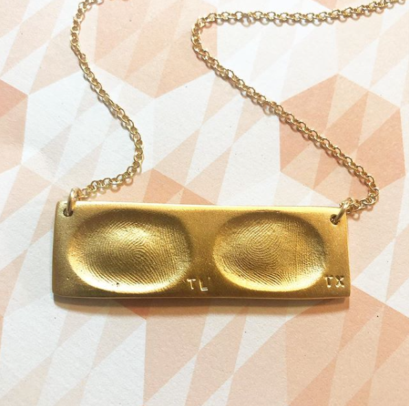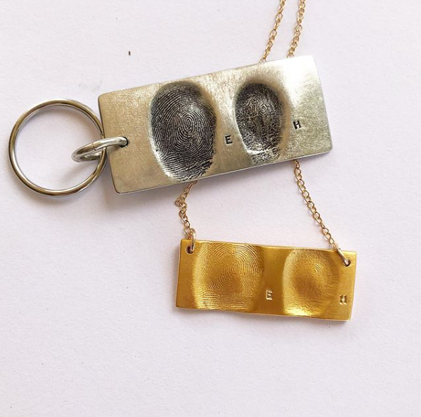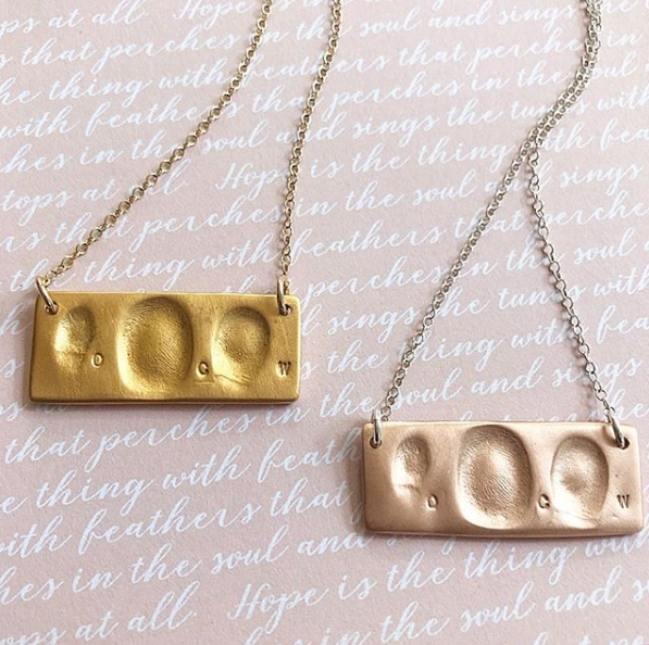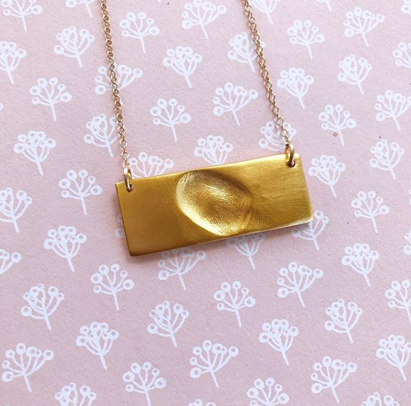 A fingerprint bar necklace adorned with prints of those you hold closest to your heart. These keepsake are made from a direct clay impression and cast in pewter with the option to 24k gold plate or rose gold plate. Prints of love keepsakes are handmade and capture a moment in time.